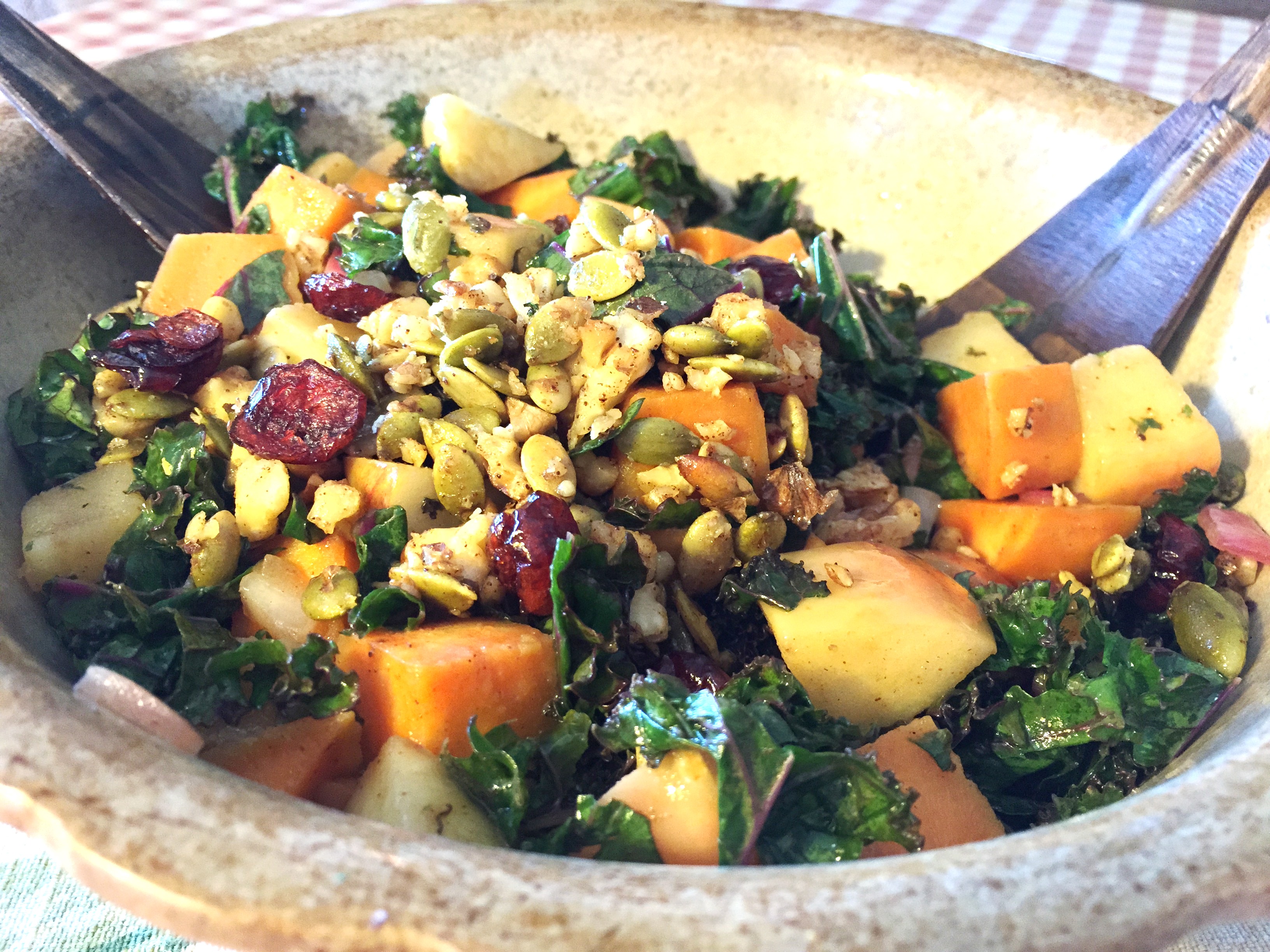 Wait, what? Salads, in the fall? With seasonal ingredients? Yes, indeedy! Just because we’ve said farewell to summer, along with its garden-fresh cucumbers, juicy ripe tomatoes, and crunchy lettuce, doesn’t mean we have to say adieu to tasty salads! By embracing some of this season’s specialties, like sweet potatoes, apples, and crunchy nuts and seeds, you can build a flavorful salad so good you won’t even miss those summer veggies. Even that hearty little green sweetheart, kale, grows well in the fall and can withstand temps as low as 20 degrees Fahrenheit. My recipe today combines all kinds of fall produce yumminess with warm smoky spices and a crunchy sweet seed/nut topping.