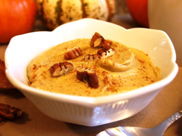 Today I thought I’d step away from the apples for a moment to share a truly de-luscious recipe. I hope you are all still riding on that pumpkin bandwagon with me because this one is really going to flip your little pumpkin lids. It is the most smooth, creamy, pumkin-y, pudding-y, autumn-spiced, breakfast-disguised-as-dessert to ever grace these pie-loving lips!