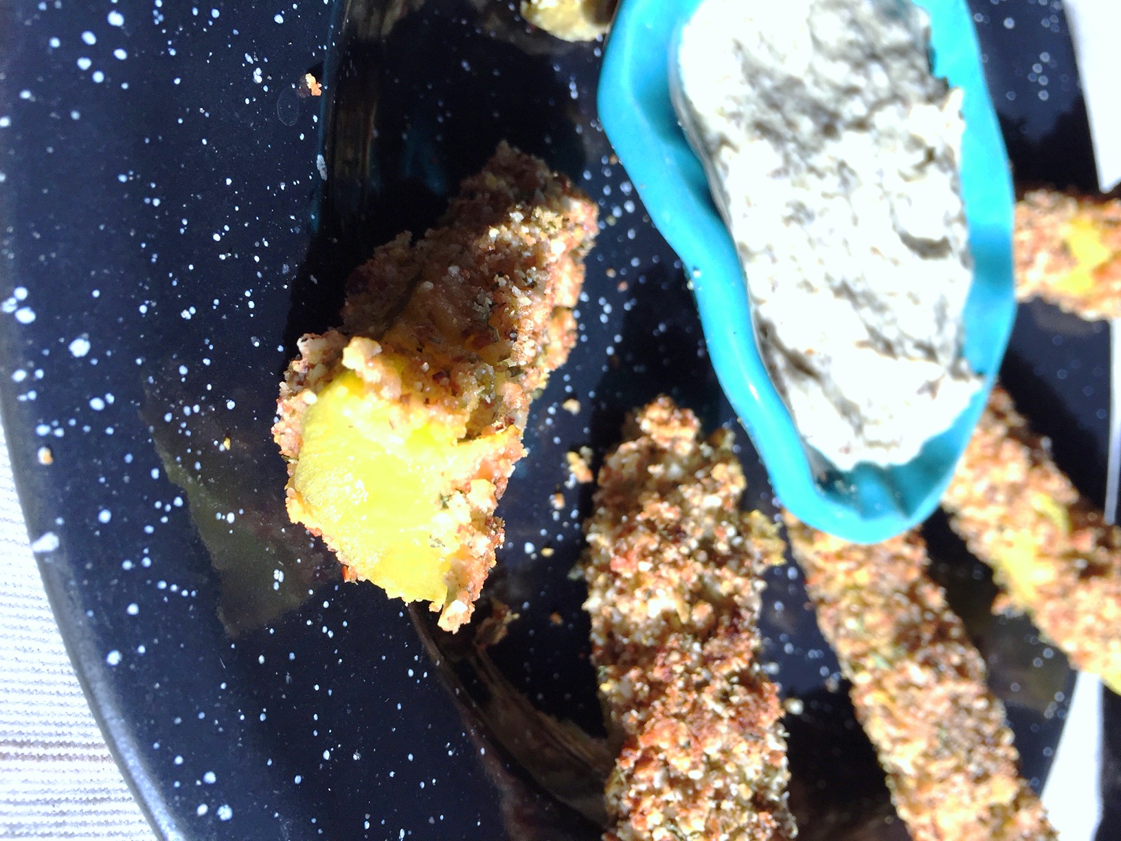 I tried several other fried pickles after that, but it has been a long time. And none were ever as good as those first ones! For some reason I started thinking about them the other day. I wanted a fried pickle, and not just any fried pickle, I wanted a Mackinac Island fried pickle! I decided that coming up with a healthy Super Bowl party appetizer would be a perfect excuse to make some! Most recipes call for dipping the pickles in an egg-based batter and then rolling in breadcrumbs and frying in oil. I decided to replace the egg batter with a chickpea flour and almond milk mixture. I attempted several different crispy coating ideas, using everything from cornmeal to coconut flour. Finally I landed on an authentic tasting coating using breadcrumbs, almond meal, and a variety of spices. In order to give it that crispy fried taste, I drizzled in just 1/2 teaspoon of olive oil into the breadcrumb mixture before coating the spears and baking for 10 minutes. While this step is optional, I would recommend it for the most authentic flavor, and it keeps the coating from tasting too dry. These pickles came out perfect, and despite being baked, were every bit as good as I remember those Mackinac Island fp’s.