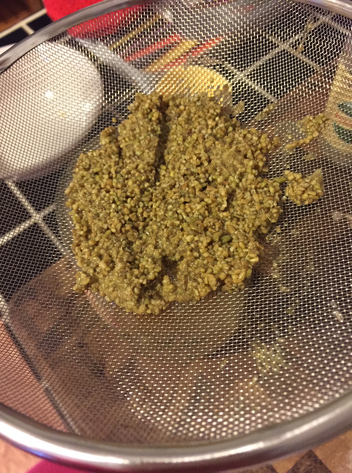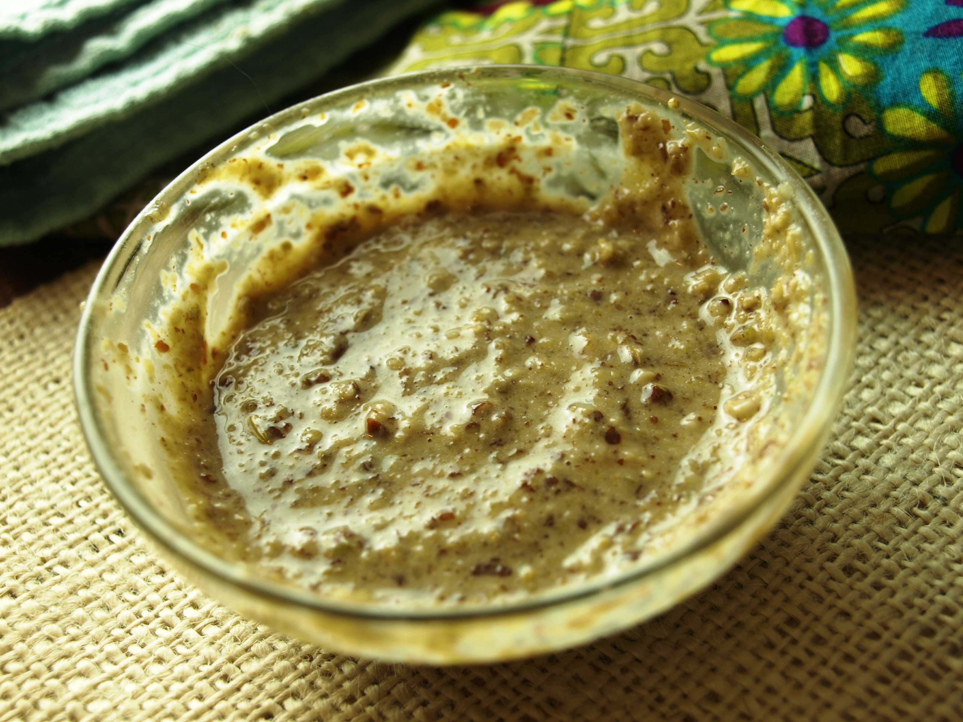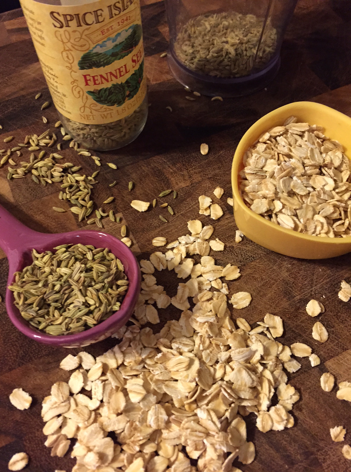 5. Now, measure out about 1 tablespoon of the cooled “tea” into a small bowl. Add about 1 teaspoon of the ground fennel seeds from the strainer (optional), 1 tablespoon of ground oatmeal, a teaspoon of ground flaxseed (or more oatmeal if you don’t have any), 1/2 teaspoon of olive or jojoba oil, and optional honey. Mix into a wet paste. Add a bit more oatmeal if it’s too runny.