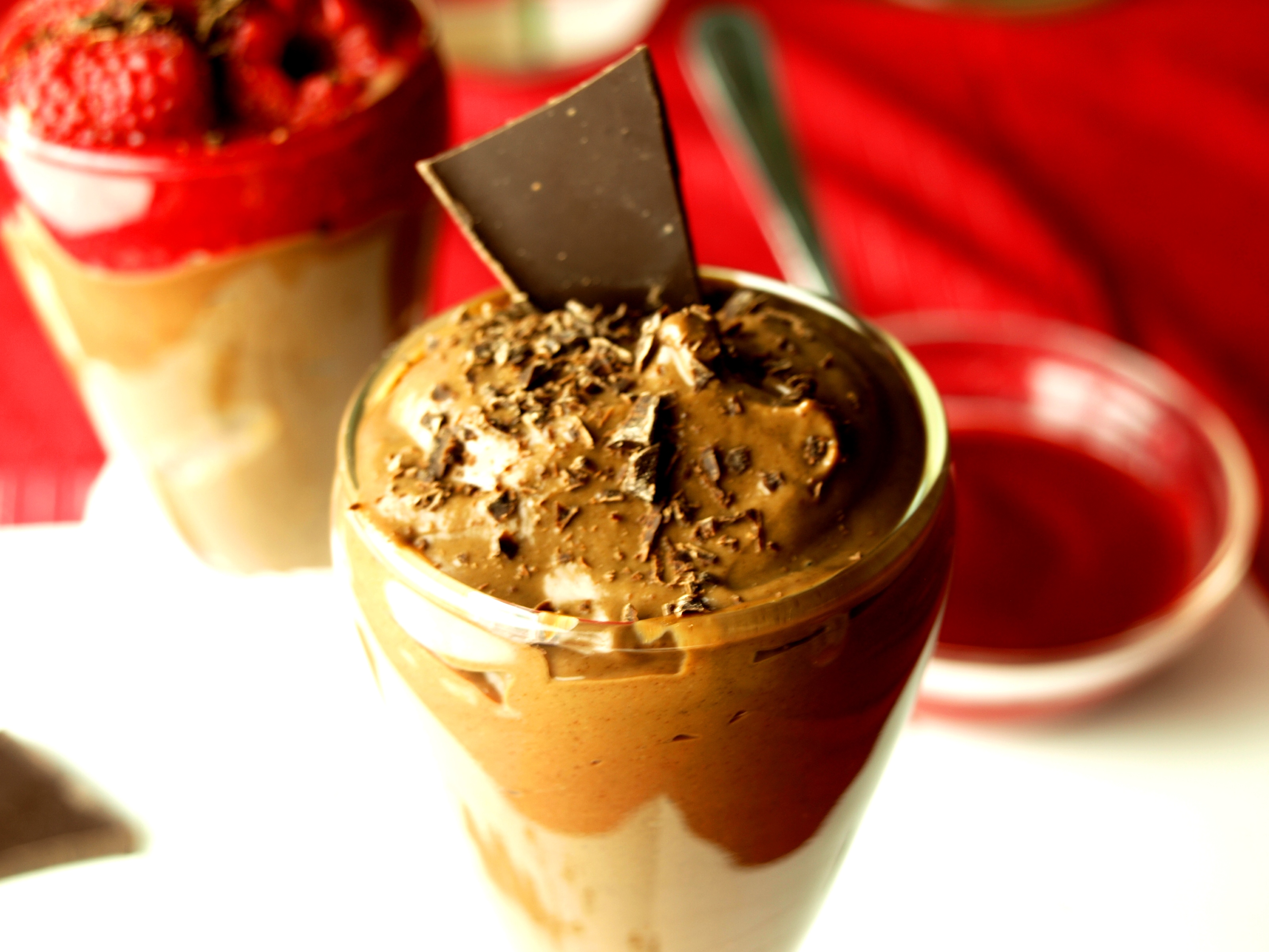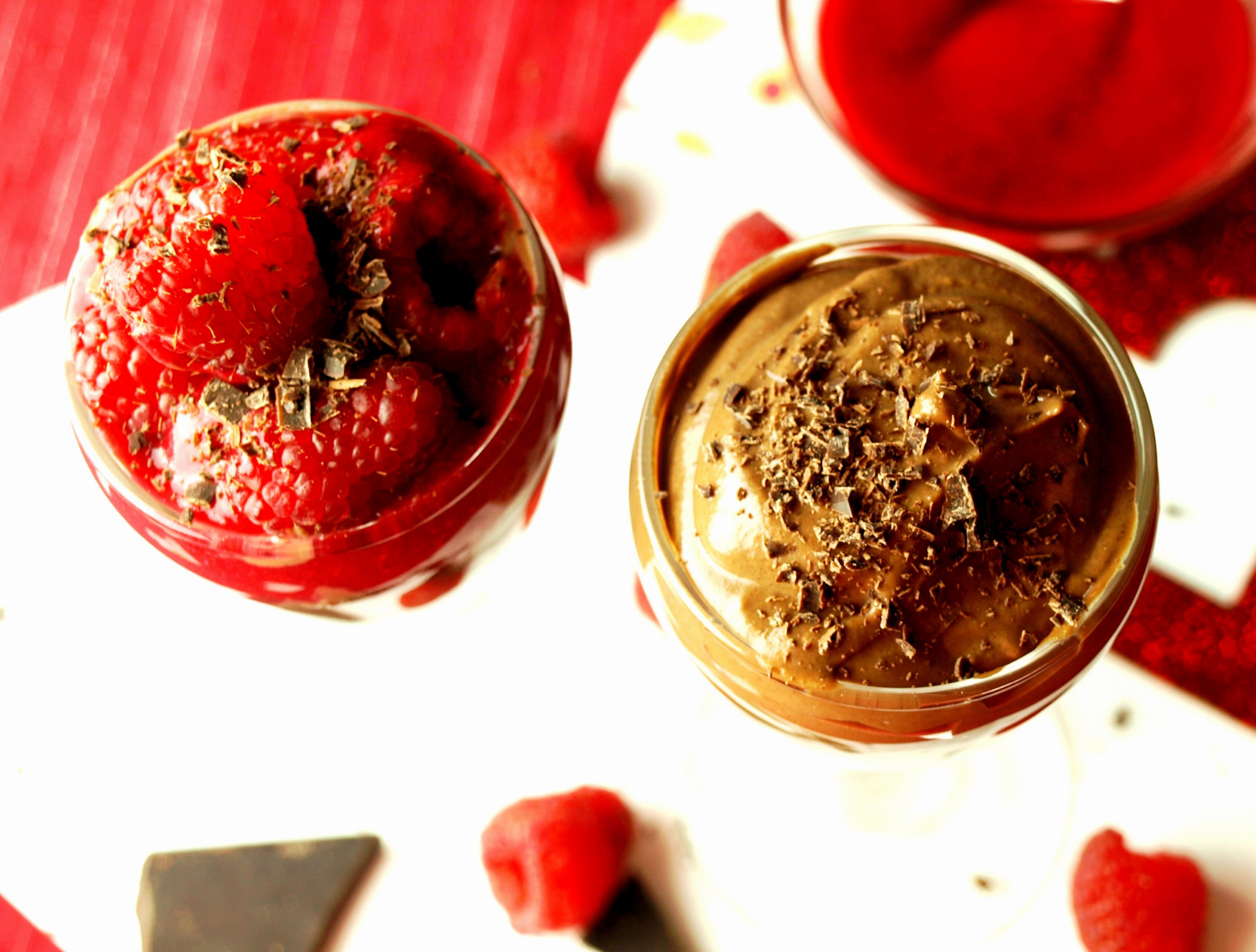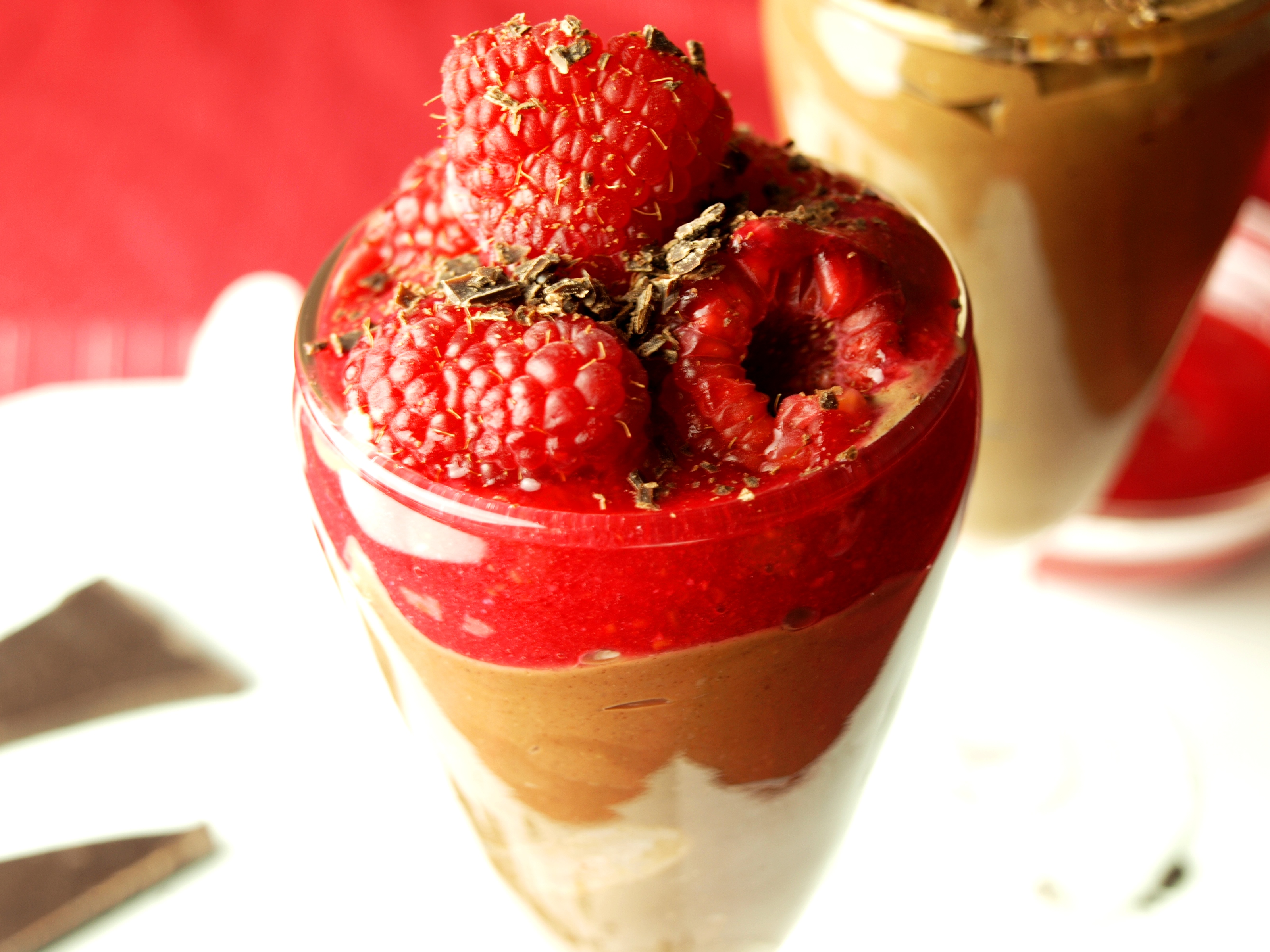 Make that… sinfully delicious, smooth, rich (secretly healthy) 4 ingredient, raw chocolate pudding with the easiest one ingredient (one minute) red raspberry sauce. Thought I’d better make that clear.