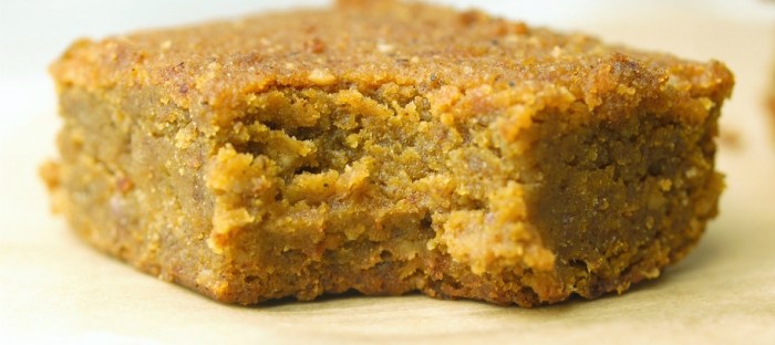 You might think the worst part about being sick for nearly two weeks was the jackhammer headache, fever complete with cold sweats and chills, sore throat, not being able to breathe air through either nostril, incessant cough, or subsequent laryngitis. You might think so, but you'd be wrong. The worst part about catching the Never-Ending Cold/Flu of … Continue reading Vegan and Grain Free Pumpkin Spice Blondies
